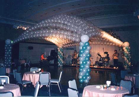 バルーンのアーチを何重にもかけ、天井を覆ってます。