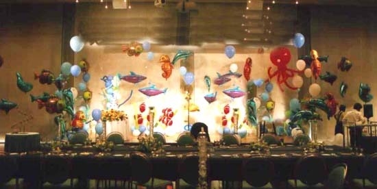 ステージ一面を海の中のようなイメージでデコレーションをしました。 イルカ・クマノミ・くじら・サメ・タツノオトシゴ・カメ…などたくさんの海の仲間達のバルーンを使用しました。海草は細長いグリーンのバルーンを使用して表現しました。