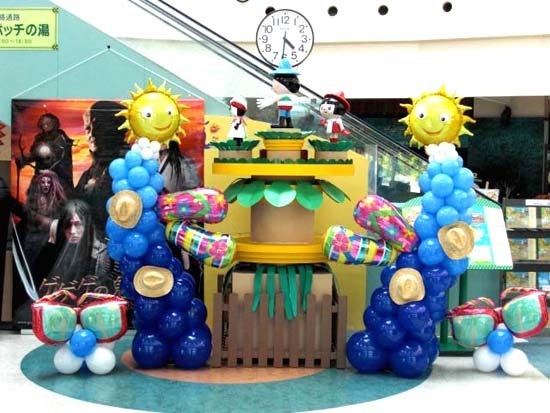 エントランスに夏をイメージした太陽のバルーン・ビーチサンダル・サングラス・麦わら帽子もアクセントに使用しデコレーションを行いました。ブルーのバルーンコラムは夏の青い空・海をイメージしています。家族でいらっしゃった方はここで記念撮影をしていたようです。 長期のデコレーションとのことでしたので、日持ちのよいデコバルーンというバルーンを使用しています。このバルーンはゴム風船と異なりビーチボールのような素材でできていますので劣化が少なく、長期のデコレーションには必須のバルーンです。