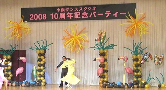 ダンスの発表会会場のデコレーションです。南国のイメージで鳥のバルーンを使用しヤシの木や水場・真夏の太陽をイメージしてデコレーションをしました