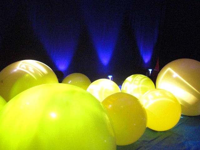 中に小さなバルーンがたくさん入っており、客席でポンポンとたたく事で割れる という演出です。