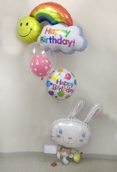 大人気の「バースデーレインボー」のバルーン、「キュートバニー」を組み合わせたいとご希望頂きました。