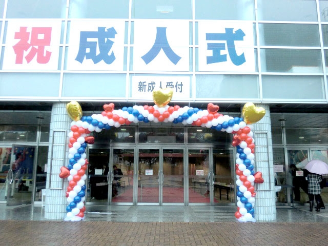 成人式会場エントランスのアーチデコレーションです。
