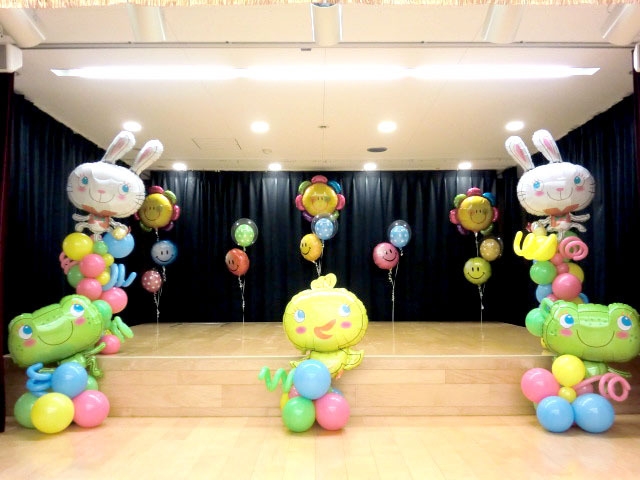 幼稚園のステージデコレーションとして、かわいいウサギやヒヨコをメインに使用しております。