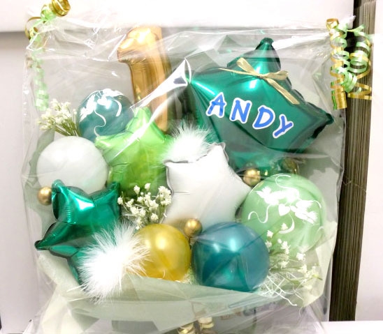 緑を基調としたお店との事でしたので、全体的に緑で統一し、数字を入れてほしいとのご要望を頂きましたので、ゴールドの数字の「1」のバルーンをお入れしてお作り致しました。
