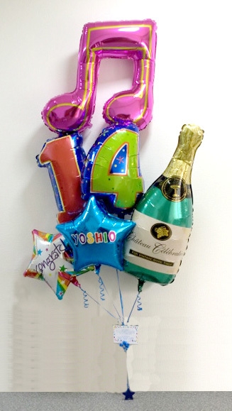 音符のバルーンと数字の「14」は必ず入れてほしいとのご希望、お酒が好きな方ということでシャンパンボトルのバルーンをお入れしました。