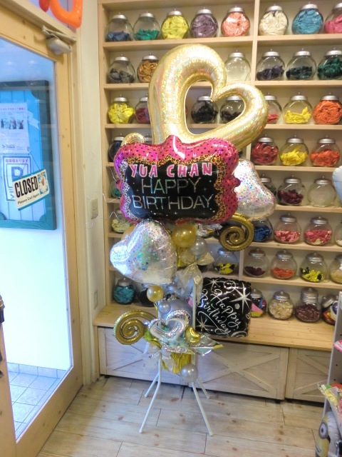 お誕生日用のバルーンにお客様の名前を入れ、大きなゴールドのハートなどで豪華に飾りつけさせて頂きました。
