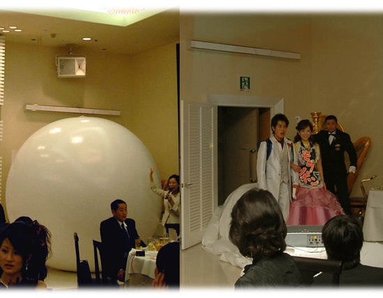 直径約2.5mの迫力満点のバルーンから新郎新婦様がご登場するサプライズ演出です!
