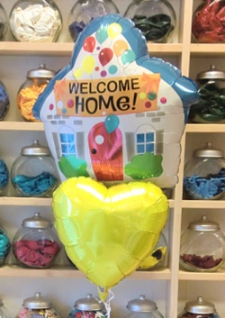 かわいいお家のバルーンに「WELCOME HOME」とメッセージが入っています♪
