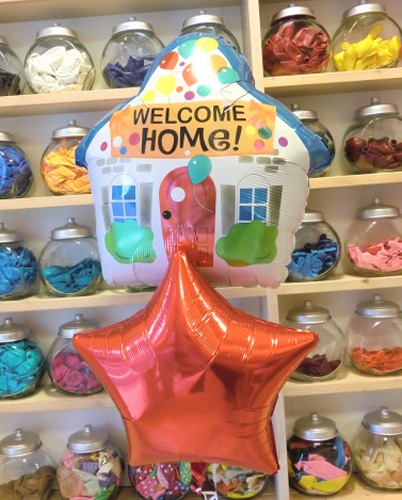 かわいいお家のバルーンに「WELCOME HOME」とメッセージが入っています♪