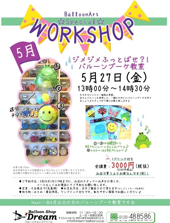 バルーンショップドリームで5月27日(金)13時からスペシャルワークショップを開催します♪