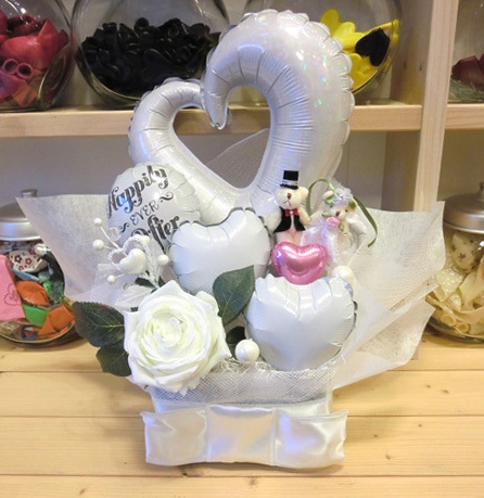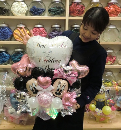 大人気・ミッキー&ミニーのバルーンを新郎新婦に見立ててデザインしたとっても豪華なご結婚お祝い用のアレンジメント。