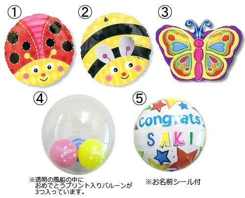 こちらは5種類のバルーンの中からお好きなものを2個もしくは3個選択していただくプチオーダーメイドタイプのバルーンギフトになります❀